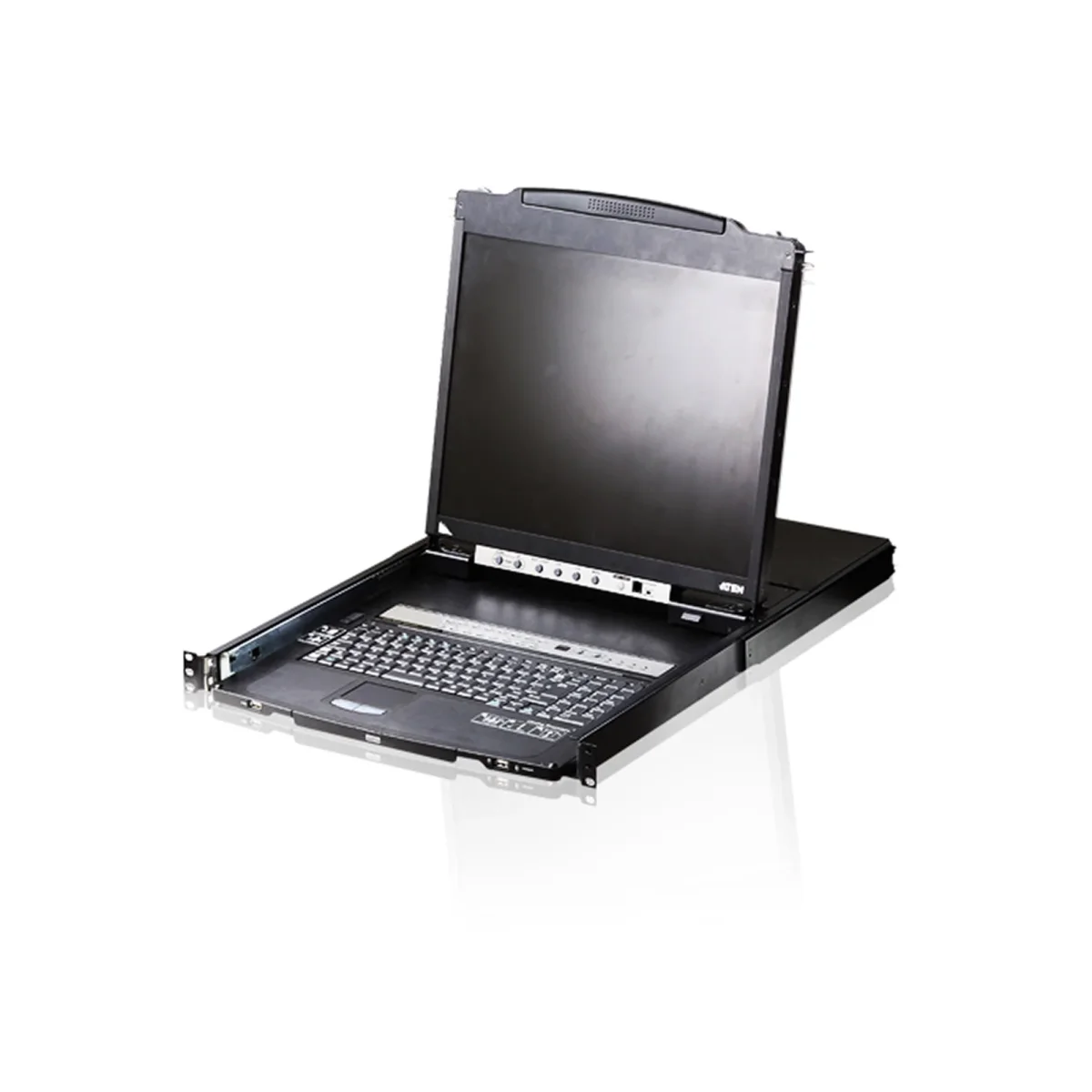 Der 19-Zoll-LCD-Monitor mit LED-Hintergrundbeleuchtung und das Tastaturmodul mit Touchpad des CL5816 lassen sich unabhängig voneinander aus dem Schrank herausziehen. Um mehr Platz im Rechenzentrum zu schaffen, kann das Tastaturmodul mit Touchpad eingeschoben werden, während der schlanke LCD-Bildschirm zur Überwachung der Computer ausgeklappt und flach anliegend am Schrank bleibt – so kann die Aktivität der Computer bequem überwacht werden. Schalten Sie schnell und bequem zwischen den Computern über Stations- und Portauswahltasten um, die übersichtlich am Tastaturmodul angeordnet sind. Und selbst bei eingeklapptem Tastaturmodul können Sie dank der am Monitormodul angebrachten Tasten Voriger/Nächster Port nach wie vor zwischen den angeschlossenen Computern umschalten.