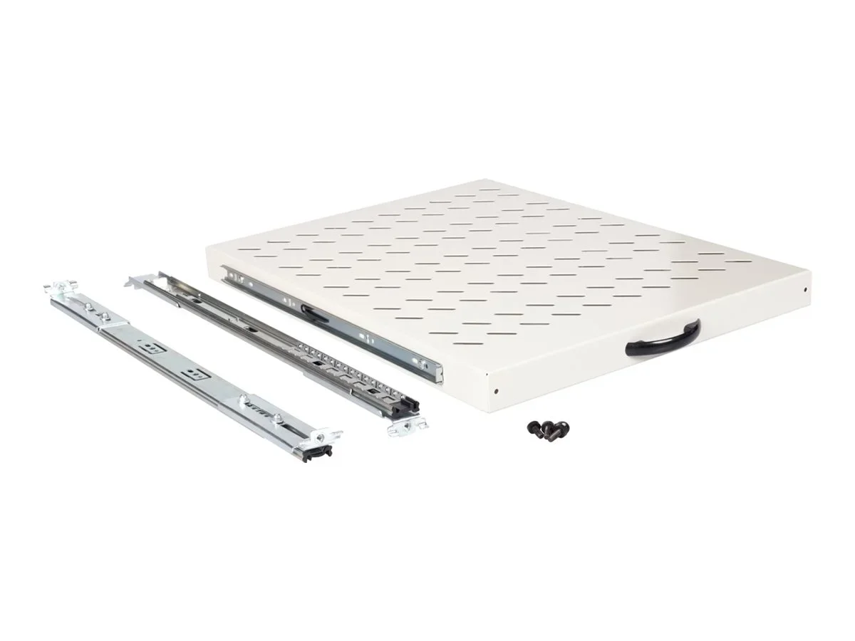 ROLINE 19 Zoll Fachboden 1 HE ausziehbar 550 T 25 kg grauDie ausziehbaren Fachböden lassen sich mühelos an den vier 19"-Profilschienen Ihrer 19"-Schränke montieren. Sie bestehen aus stabilem, perforiertem Lochblech mit hoher Tragfähigkeit und bieten somit eine ideale Ablagefläche für Ihre Komponenten. Ein im Lieferumfang enthaltener Griff kann angebracht werden, um das Ausziehen zu erleichtern. Die Fachböden sind in den Farben Grau (RAL 7035) und Schwarz (RAL 9005) erhältlich.