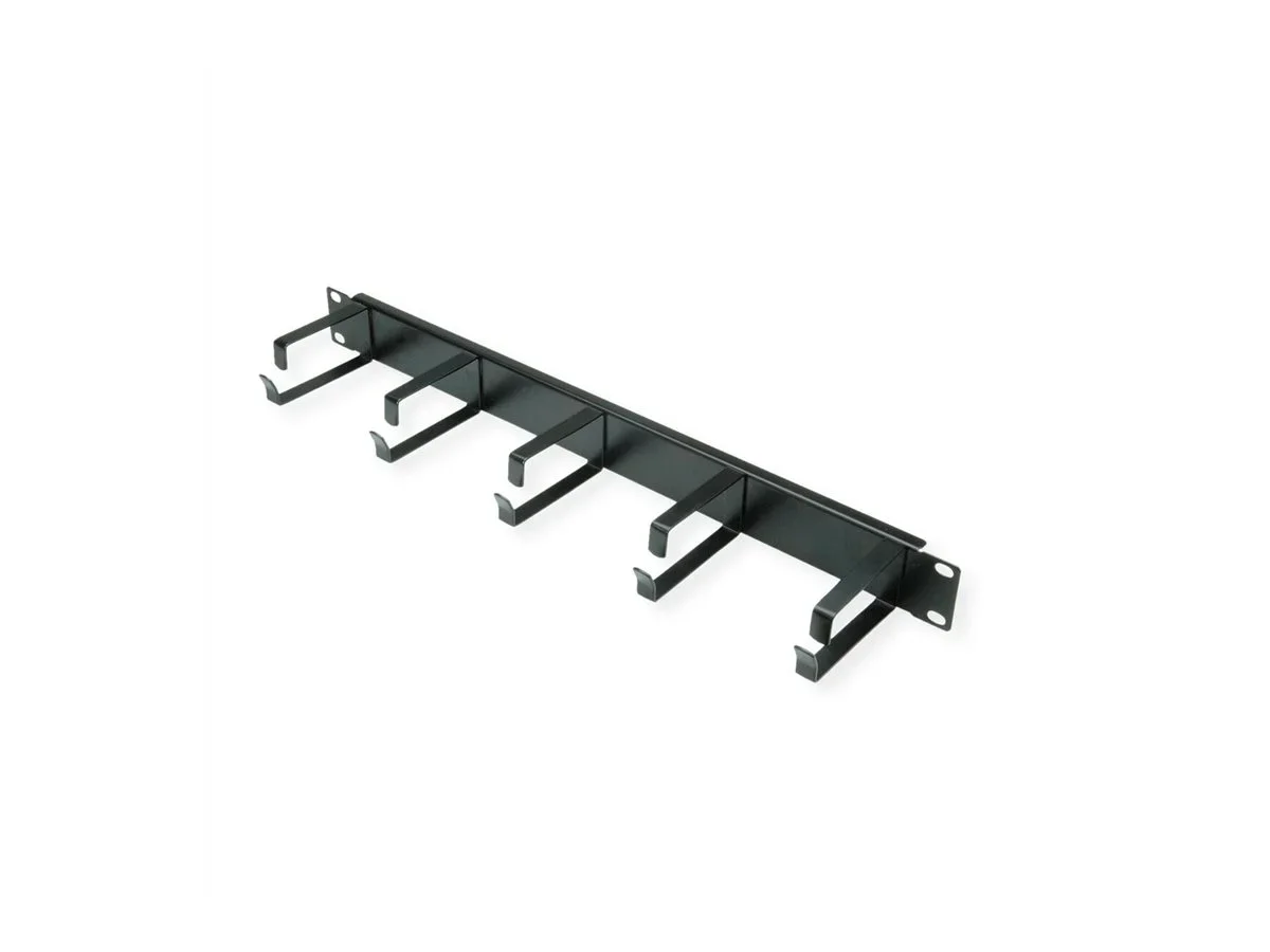19"-Kabelführung 1HE, 5 Ösen Typ G, schwarz, für horizontale oder vertikale Kabelführung Kabelführung für Server- oder Datenschrankumgebungen Geeignet für die Montage auf allen 19" Schränken und Server-Racks, so dass Kabel ordentlich verlegt werden können - wichtig für eine höhere Zuverlässigkeit der Anschlüsse im gesamten Schrank Die Kabelösen sorgen für einen idealen Biegeradius für die Netzwerkkabel und helfen dabei, einen ordentlichen 19 Zoll Schrank zu gewährleisten, vertikal oder horizontal Verhindert Kabeldehnung und dass andere Geräte verdeckt werden; gewährleistet außerdem einen optimalen Luftstrom, da die Kabel durch die optimale Halterung weniger Verwirbelungen erzeugen Macht die Installation sauberer und professioneller 1HE Qualitäts-Metallplatte 5 große "G-Typ" Kabelringe für Kabelführung.