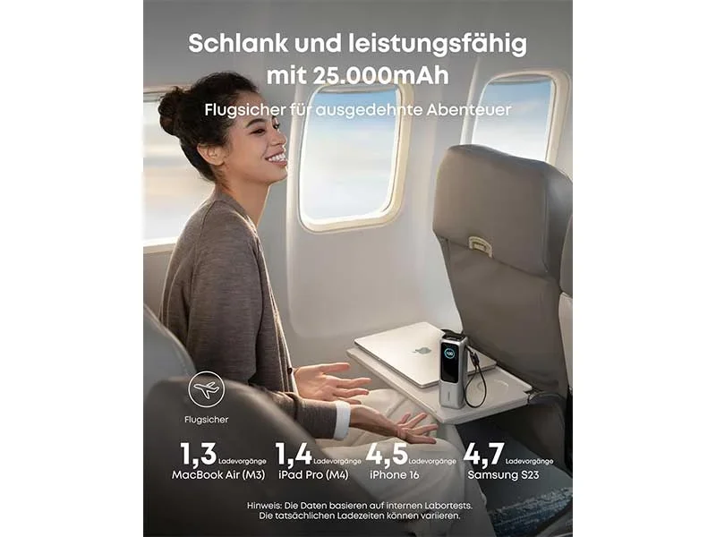 Die Anker Powerbank wurde entwickelt, um Geräte mit einer Kapazität von 25.000 mAh den ganzen Tag über mit Strom zu versorgen. Dank integrierter und einziehbarer Kabel können Benutzer eine einfache Konnektivität genießen, ohne zusätzliche Kabel verwalten zu müssen. Das Gerät unterstützt Schnellladen und sorgt so für einen schnellen Energieschub, während der ActiveShield 2.0-Schutz die Sicherheit während der Ladezyklen gewährleistet.