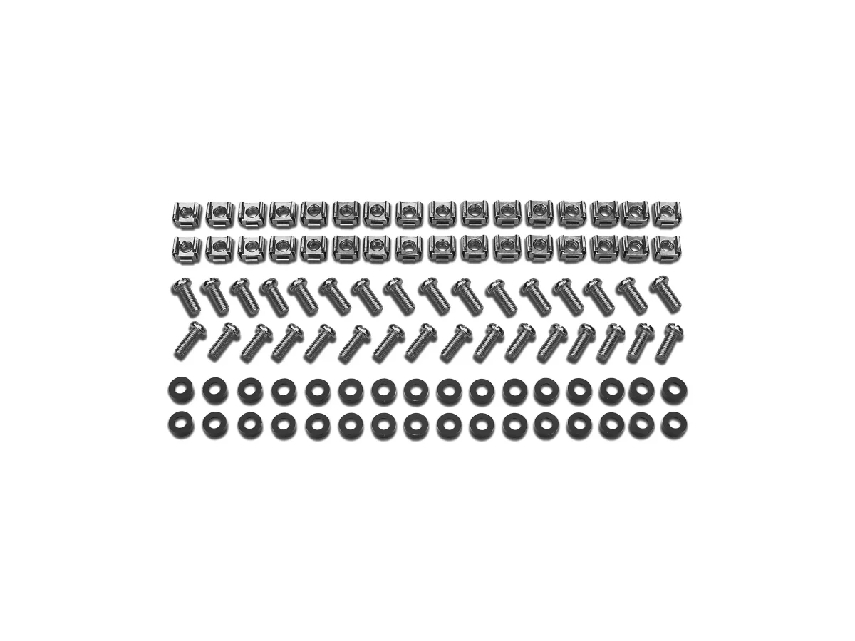 M6-Montagematerial für den Einbau von Geräten in Gehäusen mit Montageschienen mit quadratischen Öffnungen. Menge 32: M6-Käfigmuttern, Nylon-Unterlegscheiben und Schlitz-/Kreuzschlitzschrauben.