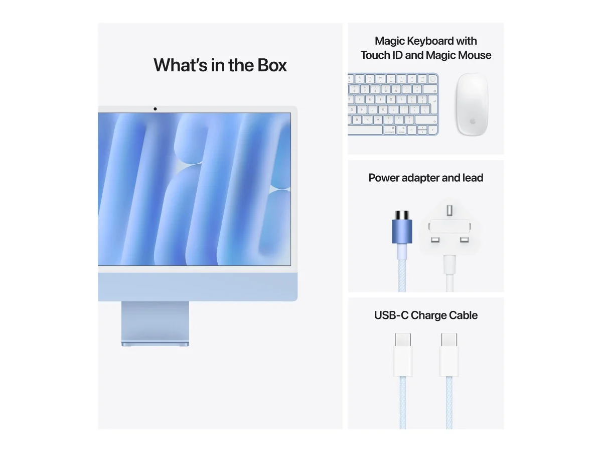 Apple iMac with 4.5K Retina display - All-in-One (Komplettlösung) - M4 - RAM 24 GB - SSD 512 GB - Apple M4 10-core - 1GbE, Wi-Fi 6E, Bluetooth 5.3 - WLAN: 802.11a/b/g/n/ac/ax (Wi-Fi 6E), Bluetooth 5.3 - macOS Sequoia 15.0 - Monitor: LED 61 cm (24") 4480 x 2520 (4.5K) - Tastatur: Deutsch - Blau