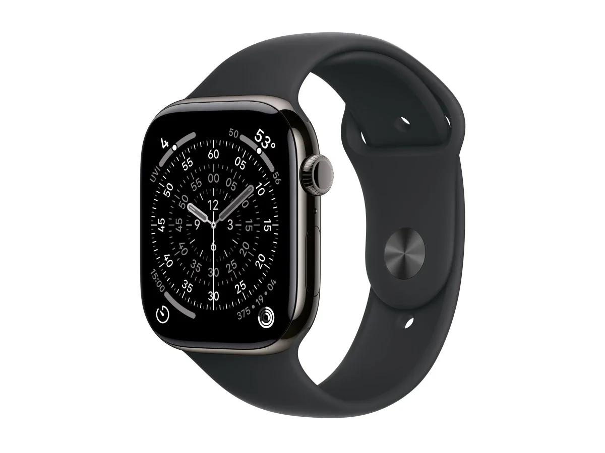 Apple Watch Series 11 (GPS + Cellular) - 46 mm - Schiefer-Titan - intelligente Uhr mit Sportband - Flouroelastomer - schwarz - Bandgröße: S/M - 64 GB - LTE, Wi-Fi 4, UWB, Bluetooth - 5G - 43.1 g