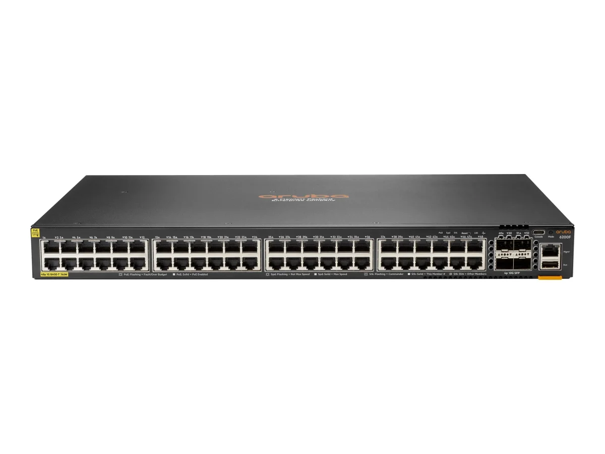 HPE Aruba Networking CX 6200F 48G Class4 PoE 4SFP+ 740W Switch - Switch - max. Stapelentfernung 10 km - L3 - managed - 48 x 10/100/1000 (PoE+) + 4 x 1 Gigabit/10 Gigabit SFP+ (Uplink) - Front und Seite zu Hinterseite - an Rack montierbar - PoE+ (740 W) - BTO