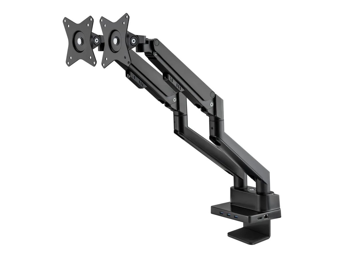 Verwandeln Sie Ihren (Home-)Office-Traumschreibtisch in eine ergonomische Realität und gewinnen Sie wertvollen Arbeitsraum zurück mit dieser kombinierten Monitorhalterung und Dockingstation von Manhattan. Da die Monitore mithilfe einer Gasfeder gehalten werden, genügt eine leichte Berührung, um die Bildschirme in den für Sie optimalen Blickwinkel zu bringen. Die VESA-Halterung für zwei Monitore unterstützt Bildschirme von 17" bis 32" mit einer Gewichtskapazität von jeweils bis zu 9 kg (19,8 lbs.). Die attraktive schwarze Oberfläche mit Pulverbeschichtung ergänzt Ihren Arbeitsbereich.