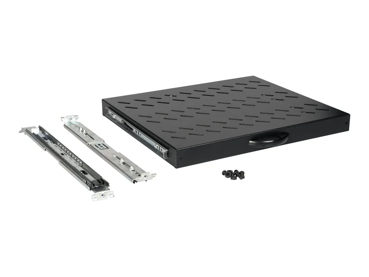 ROLINE 19 Zoll Fachboden 1 HE ausziehbar 350 T 25 kg schwarzDie ausziehbaren Fachböden lassen sich mühelos an den vier 19"-Profilschienen Ihrer 19"-Schränke montieren. Sie bestehen aus stabilem, perforiertem Lochblech mit hoher Tragfähigkeit und bieten somit eine ideale Ablagefläche für Ihre Komponenten. Ein im Lieferumfang enthaltener Griff kann angebracht werden, um das Ausziehen zu erleichtern. Die Fachböden sind in den Farben Grau (RAL 7035) und Schwarz (RAL 9005) erhältlich.