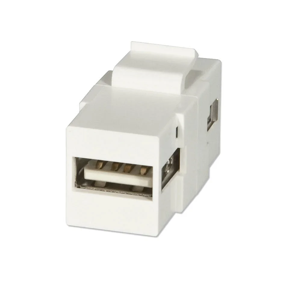 - Keystone-Modul mit zwei USB Typ A Buchsen, zum Anschluss von in der Wand verlegten USB-Kabeln